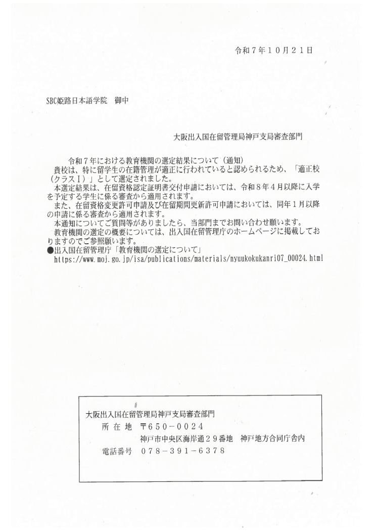 2025年10月21日付でSBC姫路日本語学院は適正校(Class I / Top-tier)に選定されました。